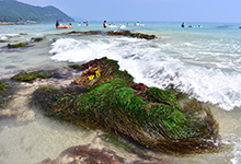 ここは伊豆半島の有名な海水浴場で、手前に見える緑色の細長い葉は、岩に固着した海草のエビアマモです。海草は海中で生育するにも関わらず、花を咲かせる種子植物です。その多くは波が穏やかな砂地に生育しているため、波が激しく当たるような岩場に生える種は世界でも5種程度と極めて少数です。エビアマモは千葉県より北に分布するスガモとともに、東アジアの岩礁で生育できる唯一の種子植物群なのです。私の研究室では、この2種の分布形成のしくみを解明し、気候変動下での変化を予測する研究を進めています。種内にどのような遺伝グループが存在し、環境に応じて棲み分けているのか?海水温上昇はどのような影響を与えるのか?そもそも、現在どこに生育し、どのような役割を果たしているのか?わからないことだらけなのです。ーそんな研究真っ只中なので、現地では「こんなにすごいエビアマモ群落があるのに、誰も見ていないなんて!」と本気で思っていました。今改めて写真を見返すと、「あの人、なんであんな岩場にいるの?」「このきれいな海でもったいない」と思われていたに違いありません。全く異なる興味が隣り合わせに見える写真で、密かに気に入っています。