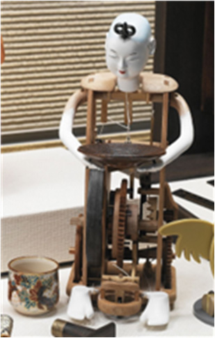 江戸時代に製造された木製のからくり人形の一種で、ゼンマイの動力とカム機構を利用して、お茶を運び戻ってくるような動作を行います。