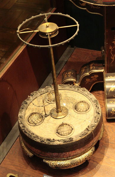 佐田介石案、田中久重作。仏教における須弥山説を元に作られた天象儀で、上部の二つの小球は太陽と月を示します。見かけの宇宙「視象天」と実際の宇宙「実象天」の関係を解説するため作られました。(寄託:金竜山浅草寺)