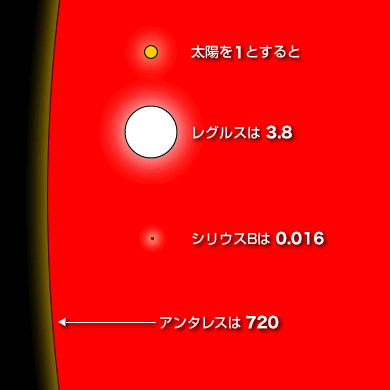 絶対等級がわかると、その星の出す全エネルギーを求めることができます。一方、星の表面温度からは、表面の単位面積あたりから放射されるエネルギーの量がわかります。したがって、星の全放射エネルギーをこの値で割ってやれば、星の表面積がわかり、半径も求めることができます。例えば、レグルスは全放射エネルギーが太陽の380倍ありますが、表面温度が13000度で単位面積から放射されるエネルギーは太陽の26倍しかないので、表面積は15倍、つまり半径は太陽の3.8倍あることがわかります。また、同じようにして、さそり座の真っ赤な1等星アンタレスは、半径が太陽の700倍もあることもわかります。このような星は赤色巨星とよばれています。反対に、おおいぬ座の1等星シリウスのまわりをまわっているシリウスBという星の半径は、太陽の約1/60、つまり地球のたった1.7倍しかありません。このような星は白色矮星とよばれています。