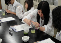 実験開始前に白衣を着用して実験室内で記念撮影を行いました。そして、植物細胞及びDNAについて解説を聞いた後,エタノール沈殿法によるDNA抽出を体験しました。