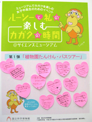 植物園を会場に、植物の秘密を解明する仕事・研究についてのトークを聞いたり、温室をたんけんしたり、葉っぱのクラフトを体験するイベントでした。まず、国立科学博物館の植物研究部の研究員である堤千絵さんから、植物を研究することや、研究者になるまでの道のりを分かりやすく解説してもらいました。その後、研究室、分析室の見学。午後は温室をたんけんしながら、植物の観察をしました。最後に押し葉のしおりづくりで完成品はお持ち帰り。