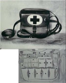 日露戦争後の明治40(1907)年に装備品の大改正が実施された際に、制式となった包帯嚢。主な内容品は巻軸包帯が主で、
