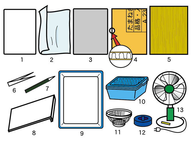 吸水紙が吸い取った水分を扇風機からの送風で気化する役割を持ちます。不要になった段ボール箱を解体して、A3の大きさに切ってつくることができます。このとき内部の波上の板紙(ラーメン構造)が見える面がA3の縦(長い方)になるようにします。
