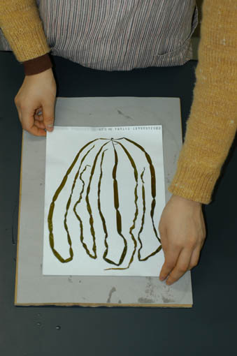 ひきあげた台紙を吸水紙(新聞紙でもよい)の上にのせます。海藻の水分は吸収紙に吸い取られ、海藻のもつ粘質物がのりとなって台紙に貼りつきます。