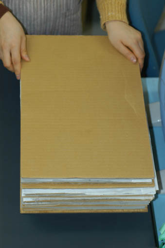 何枚も作る場合は、B13で述べたセットを繰り返し重ねます。段ボールの幅と同じ高さまではOKですが、それ以上積み上げると崩れることがあります。