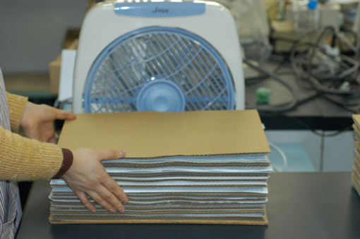 段ボールの孔がみえる面を扇風機に向けます(扇風機からの風が通り抜けるようにする)。