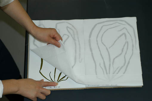 さらし布の上から触ってみて乾燥しているのを確認できたら、ゆっくりとはがします。海藻は台紙とさらし布の両側に密着しているため、勢いよくはがすと、さらし布の方にはりついてくることがあります。