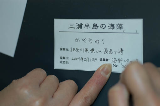 押し葉にした海藻の情報を記録しておきます。ラベルのタイトル(写真の例では、三浦半島の海藻)は、コレクションの目的に応じて上端にレイアウトしておくするとよいでしょう。