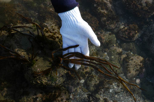 採取するまえに海藻がどんな様子で生えていたかを観察しておきましょう。指を保護するために軍手などをはめましょう。 この海藻は中空で体全体が浮きとなって立ち上がっています。ところどころにくびれがあるのがわかりますか?