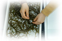 海藻の押し葉標本をつくるのは簡単です。ただし、海藻がふだん海中で生活している生き物であるために、陸上植物の押し葉をつくるのとは少々やり方が異なっています。海水に触れずに採ることはできませんし、新聞紙にただはさんでも押し葉にはなりません(水分が残れば生ゴミになります)。良い標本を得るためには、海藻の特質に合わせた方法と道具をもちいる必要があります。