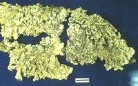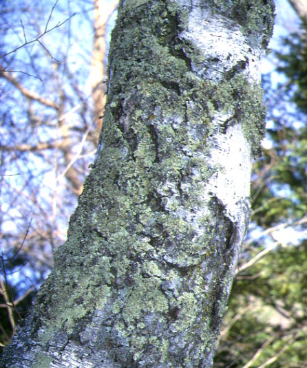 樹皮上に生育する葉状地衣類。地衣体表面は淡黄色、裏面は黒色、黒い偽根で樹皮に着生する。地衣体の縁にそって連続した白い粉芽をつける。ウスニン酸とレカノール酸を含む。ヨ−ロッパを除く北半球に広く分布するが、日本では長野県の数箇所でしか生育が確認されていない。