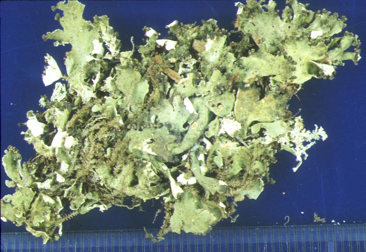 スギの樹幹や株もとに蘚苔類と共に生育する。小形の葉状地衣類、直径20cmに達するコロニ−を形成する。地衣体表面は灰緑色で平滑、裏面は類白色で長さ2-3cm。葉縁に褐色で小型の子器をつける。本種はヒマラヤ山地、中国からも知られているが、日本では屋久島の標高約800m付近のスギ原生林に生育する。地衣体は紫外線をあてると青白く光る。