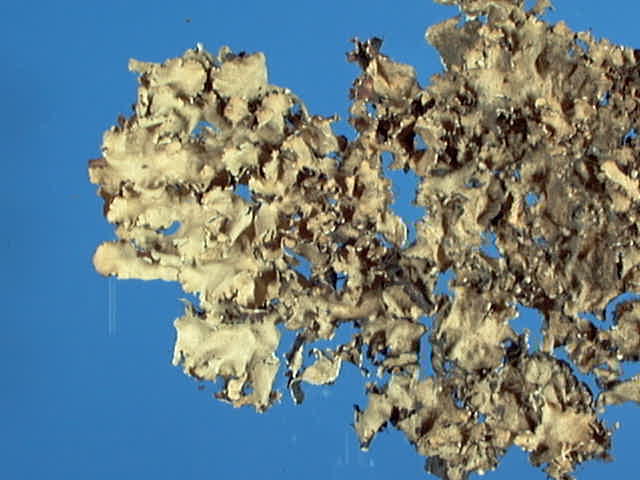 暖地の岩石または樹皮上に生育する中形の葉状地衣類。地衣体は径10cm内外。裂片は幅5-10mm。表面は灰白色で裂芽を持つ、裏面は黒色で叉状に分枝した偽根を持つ。髄層は白色、橙色、黄色でアトラノリンとスチクチン酸を含む。ヒマラヤ・タイ・台湾、日本まで分布するが稀産種である。日本では三峰山、高知県工石山、徳島県大森山の3ヵ所から記録されているだけである。