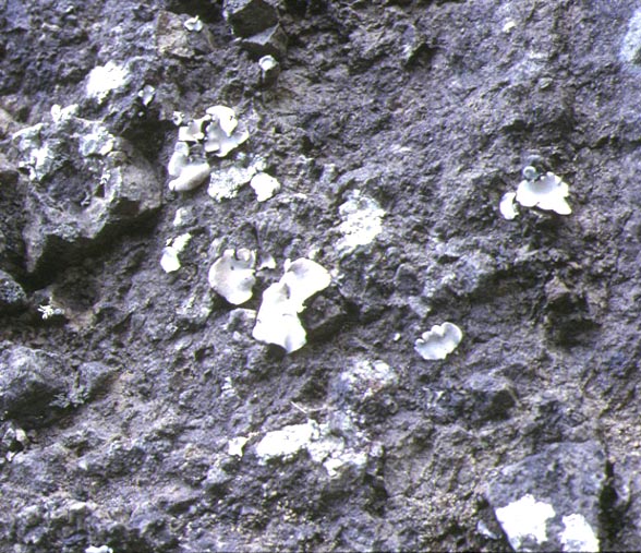 垂直に近い岩上に生育する大形の葉状地衣類。地衣体は円形、単葉から複葉で臍状体で基物に固着する、径2-5cm.表面は褐色で全体に灰色の粉霜がある。裏面は黒色で偽根を密生する。地衣体中に埋没した被子器を持つ。北半球に広く分布するが、日本では北海道夕張岳と秋田県男鹿半島だけに生育する。