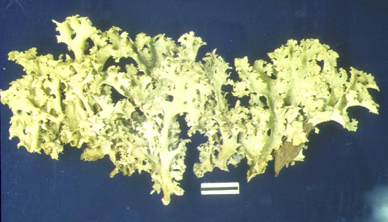 高山の地上に群生する樹枝状地衣類。地衣体は淡黄色、高さ3-4cm,幅2-5mm、全体に明瞭なしわがあり縁に黒色の粉子器をつける、表面に白色点状の偽盃点を持つ。北半球の高山や高緯度地方に広く分布する。国内の産地は北海道大雪山系だけである。