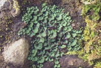 亜高山の針葉樹林内や北海道の低地の地上に蘚類と共に生える小形の葉状地衣類。地衣体は単葉性、径0.5-1cm、共生藻は緑藻で地衣体表面は緑色、頭状体は裏面に突出する、裏面は類白色で黒褐色の明瞭な脈を持つ。国内では稀で北海道から本州中部にかけて分布するが産地は限られている。