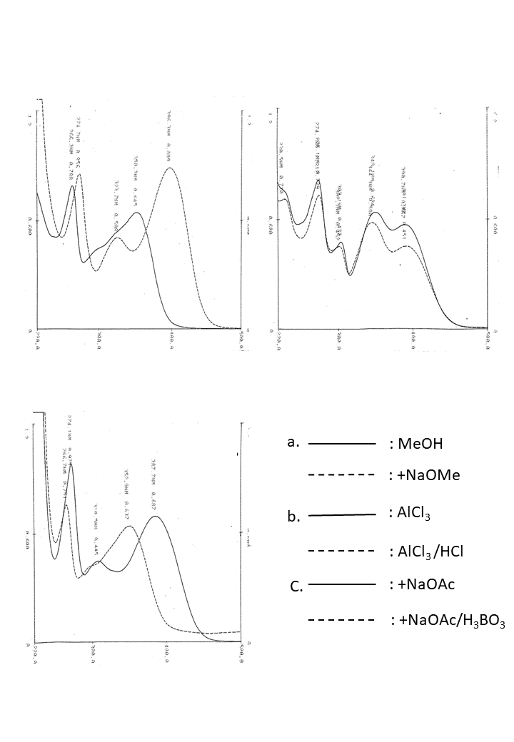 | 紫外/可視吸収 | UVλmax (nm): MeOH 266,296sh,350; +NaOMe 275,324,396 (inc.); +AlCl3 288sh,274,303,348,391; +AlCl3/HCl 231,275,302,344,391; +NaOAc 274,311,388; +NaOAc/H3BO3 267,297sh,353 |