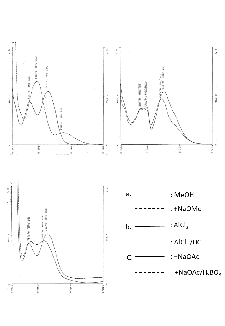 | 紫外/可視吸収 | UVλmax (nm): MeOH 228sh,274,329; +NaOMe 296,375 (dec.); +AlCl3 231sh,263sh,282,300, 352,386sh; +AlCl3/HCl 229sh,258sh,282,298,346,386sh; +NaOAc 280,319; +NaOAc/H3BO3 224,272,331 |