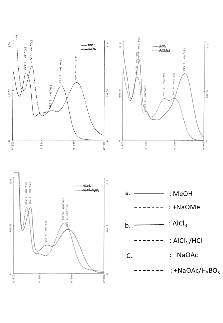 | 紫外/可視吸収 | UVλmax (nm): MeOH 258, 265sh, 358; +NaOMe 272, 330, 409 (inc.); +AlCl3 276, 434; +AlCl3/HCl 270, 297sh, 364, 400; +NaOAc 273, 325, 390; +NaOAc/H3BO3 262, 379 |