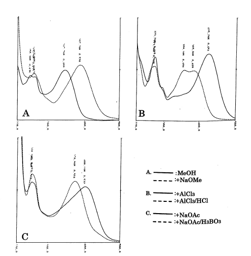 | 紫外/可視吸収 | UVλmax (nm): MeOH 255, 267, 348; +NaOMe 265, 388 (inc.); +AlCl3 274, 426; +AlCl3/HCl 273, 295sh, 359, 386; +NaOAc 260, 400; +NaOAc/H3BO3 260,371 |