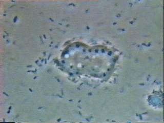 左右に長くなった粘菌アメーバが2つに分かれはじめました。