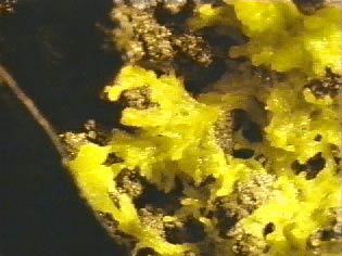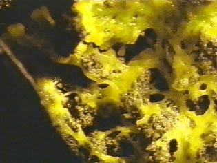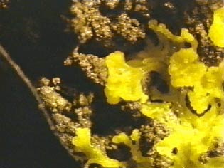 倒木上を移動するモジホコリの黄色い変形体
