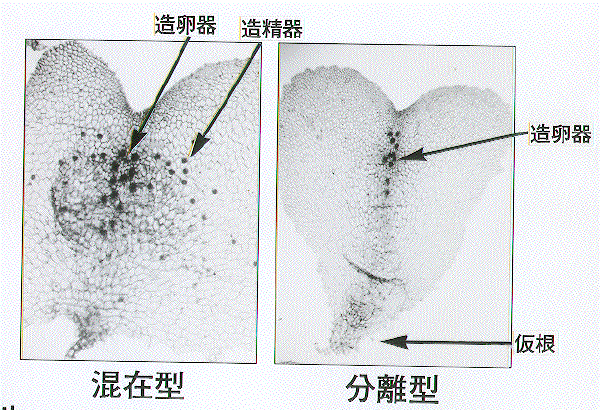 2-1.造卵器と造精器の混在型と分離型の形態ミズゴケ培地などで配偶体をゆっくり育てると、造卵器の近くに造精器を形成する混在型と離れた仮根の位置か別の配偶体に形成する分離型を区別できます。A1型は混在型の頻度が高く、A2、C型は分離型です。 |