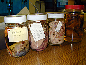 未消化から消化段階2の標本は各々1個体ごとに保存容器に入れる.消化段階3−4のものに関しては,肉質部と取出した上下顎板を一緒にして1個体分ごとに保存容器にいれる.消化段階5−7の顎板に関しては,上下の顎板のペアが確認できるものは上下一緒に,またペアの確認できない顎板に関しては,上顎と下顎に分けて,保存容器に入れておく.いずれの場合も,耐水紙を小さく切ったラベルに胃袋を取出した動物(標本番号),採集日時,採集地点等を鉛筆で記入し,容器に入れておくことを忘れないようにする.
