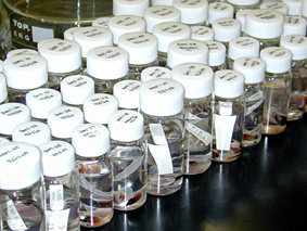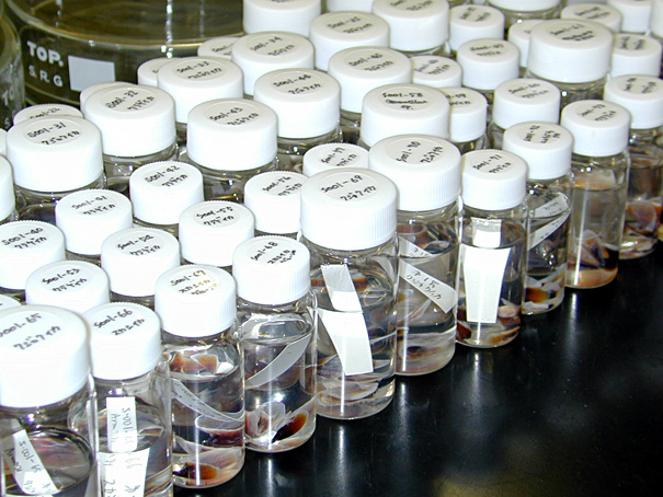 保存容器は標本の大きさに応じて,各種サイズを用意する.密閉度を考慮して,中蓋か内パッキングのついた容器にするべきである.大型の標本は,ポリエチレン製の20L広口瓶や2L,3Lの透明エンビ製のものが適している.小型の顎板に関しては,6−20mlのガラス製スクリュー管瓶を容量別に数種類そろえるとよい.