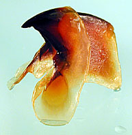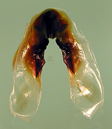 | 嘴は三角形で、吻端鈎状。嘴刃長は頤長とほぼ同じ。嘴刃はほぼ直線で楔状に短く進入。 | 側板は長方形で下辺に弱い湾入。フォールドはない。 嘴刃と翼の接続部に菱形の高い翼歯がある。 |