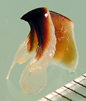 | ササキテカギイカによく似るが、キチン化する大きさと,翼歯がやや幅広く、翼が長いことで区別。 | 嘴刃長は頤長の2倍。 嘴刃はカーブし楔状に長く伸長。側板は菱形。フォールドは弱い。 | 翼歯は細長い板状で、上部は翼肩よりでない。成体ではどうなるのかしら? |