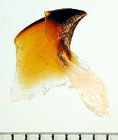 | 嘴はやや高く、嘴刃長は頤長の1.5倍。嘴刃ゆるく曲がり、長く楔状に伸長。 | 側板は短く平行四辺形、弱い畝状のフォールドが走る。 翼付け根は盛り上がり、接合部に続く。 |