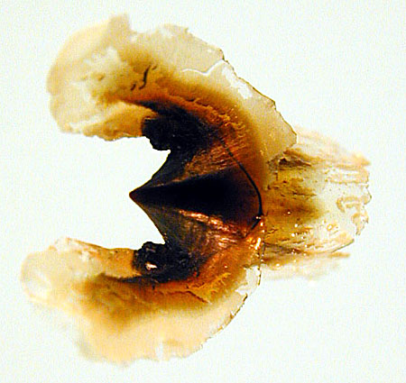 | 大きさ、色付き具合ともホタルイカに似るが,吻が尖り、翼歯が三角形で大きいことで区別。 | 嘴刃長は頤長と同じ。 吻はとがり嘴刃は直線で伸長部なし。側板は菱形。フォールドは非常に弱い。 | 翼歯は三角形で大きく、翼付け根は半透明な盛り上がりで覆われる。 |