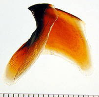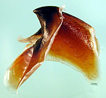| 嘴は小さく先端フック状に尖る。嘴刃長は頤長の2倍ほどでほぼ直線。 | 側板は平行四辺形で、下辺に弱い湾入。弱い幅広のフォールドが斜めに走る。 | 翼歯は平たく、嘴刃と100度の角度をなし張り出す。翼付け根は高くリッジとなり翼歯の間に深い溝が形成される。 |