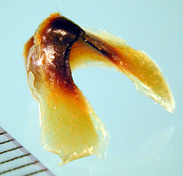 | 嘴の先端は平たい。嘴刃は吻端から大きく曲がり、翼の接合部に向かって緩くなる。嘴長は頤長の1.2倍。 | 側板は平行四辺形。 嘴刃と翼の接続部は約110度で張り出す。 |