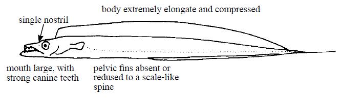 Body extremely elongate and compressed, ribbon-like (up to 2.5 m). Mouth large, not protracticle; strong canine teeth in jaws, those at front of upper jaw fang-like; minute teeth on palatines, none on vomer. Single nostril on each side of head. Small spinescent gill rakers present. Dorsal fin low and long, beginning shortly behind eye, anterior part with spines and posterior part with soft rays, spinnules part shorter than soft part. Pelvic fins reduced to a scale-like spine in Tentoriceps or completely absent in Trichiurus. Anal fin low, or reduced to embedded short spinnules. Caudal fin small and forked or absent like tapering to a point. Lateral line single. Scales absent. Color: body generally metallic silvery with blue tint, darker dorsally; pectoral fin semi transparent; dorsal and anal fins sometimes tinged with pale yellow. Usually no distinct marks or blotches on body. Voracious predators distributed in tropical and temperate seas of all oceans. generally inhabit deeper waters of continental shelf and slope. Trichiurus important local fisheries, especially in the southeast Asia. Flesh tasty, but scanty in Trichiurus.
