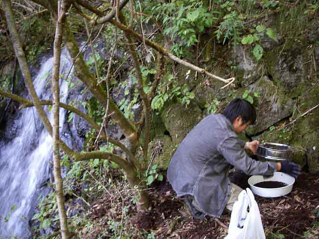 A gorge of Kanayamazawa (left); Kyohei Watanabe sifting leaf litter at Yato (right)