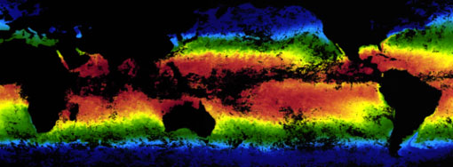 写真:ADEOS衛星で観測した海表面水温,赤で示される高温水域と青で示される低温水域が、赤道を挟んで南北に帯状に分布する。赤色が熱帯海域、赤から黄色が亜熱帯海域、緑から青が亜寒帯海域、青が極圏海域。1997年4月(提供:NASDA)