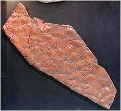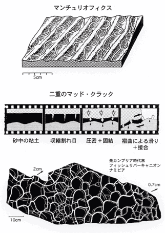 水たまりが干上がり、泥が乾燥して収縮すると、多角形の割れ目(マッド・クラックあるいは乾裂といいます)ができます。数億年前の海の干潟でも、同じようにマッド・クラックができましたが、ここに展示するものは、多角形が二重になっている点で普通のものと異なります。一見、生物の痕跡のように見えますが、マッド・クラックが地層の重さで圧縮され、地殻変動による褶曲で地層の面に沿ってずれることによりできました。