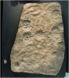 この標本に見られるたくさんの同心円状の構造は生物が関与してできたものであることは確実ですが、それをつくった生物を特定することはできません。同心円状に成長する正体不明の生物が残した痕跡のようです。生痕化石の世界では、特に古い時代のものでは、それをつくった生物の正体がわからないことの方が多いのです。