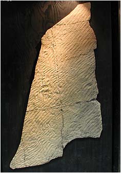 波や水流あるいは風によってできる砂の紋様は、リップル・マーク(漣痕)と呼ばれます。この尾根部分が二重になった美しい標本は、波の作用と左斜め方向からの弱い水の流れでつくられ、11億年以上も前の静かな渚の情景を物語っています。