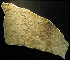 この化石も、突然の土石流で生き埋めとなったヴェンド生物です。ゾウの皮膚状の構造は、バイオマットの跡です。細長い化石はファイロゾーンです。曲がりくねったひも状のものはアウロゾーンと呼ばれる化石ですが、おそらく偏形動物のはい跡と考えられます。この新しい解釈の根拠は、その行動パターンにあります。ファイロゾーンに正面から突き当たるとその上か下を迂回しますが、斜めに行き当たるとこの“邪魔者”に沿って迂回しています。