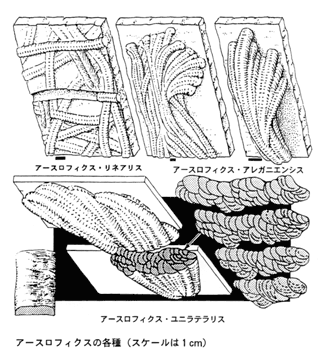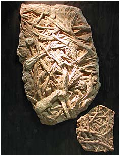 この標本は地層の下面を見ています。これは泥を飲み込んで栄養分を摂食するミミズ型動物(英語でwormという)の巣穴群で、アースロフィクスという生痕化石です。