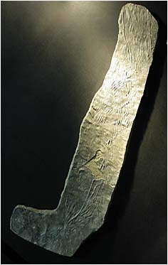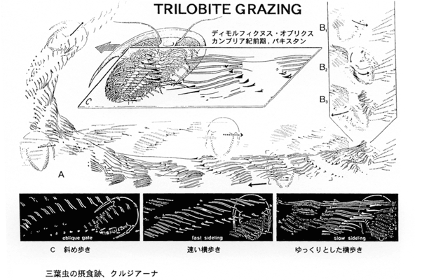 このはい跡を残した三葉虫は、横に動きながら海底面の栄養物を食べていました。進む側の歩脚を力強く使って太くて短い深い跡を残し、反対側の歩脚は引きずりながら掻き、長い跡を残したようです。