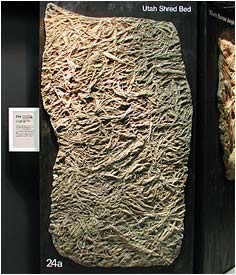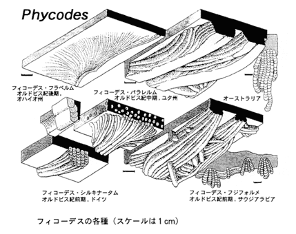 アースロフィクスと同じ様な方式でつくられたものですが、扇型ではなく、縄状の集合体になるのが特徴です。アースロフィクスもフィコーデスもそれをつくった生物は不明ですが、掘削の様式が異なるため、別の生痕化石の名前(学名)がつけられています。