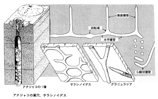 アナジャコのなかまは、海底に深くて複雑なトンネルを掘って住んでいます。そのトンネルを海で見るのは困難ですが、地層の中に化石となって残ったものは普通に見られ、サラシノイデスと呼ばれています。浅海に繁栄していた三葉虫が古生代末に絶滅し、中生代になるとさまざまな甲殻類が現れ、より強固な外骨格を持つなかまが海底深く新天地を開拓していきました。生痕化石は、その開拓の歴史を私たちに教えてくれます。