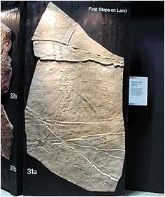 アポロ11号のアームストロング船長の月面への第一歩は、人類史に残る出来事です。この標本は、海から陸上に進出した最初の動物の歩行跡です。