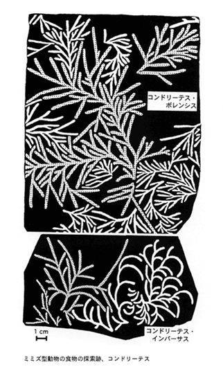 愛媛県から大阪府南部にかけて分布する白亜紀後期の和泉層群から、コダイアマモと呼ばれる世界最古の海の被子植物(アマモのなかま)の化石が知られています。この化石を詳しく観察すると、決して折れ曲がったり、互いに重なりあったりせず、またこの化石は炭ではなく黒色の泥からできており、植物化石らしくありません。コダイアマモは、正体不明の動物が食べ物を探索しながらたい積物の中を掘削していった跡、すなわち生痕化石なのです。