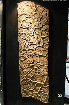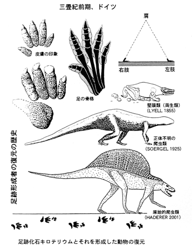 イギリスの地質学者ライエル(1797〜1875年)は、この足跡はそれまで同じ地層から唯一見つかっていた両生類のステゴセファルスのものと考えました。しかし、この動物がいくら体をねじりながら歩いたとしても、“親指”が中心線より外側に向くことはなく、彼の説は支持されませんでした。ゼルゲルという古生物学者は、この足跡化石からそれをつくりだした動物の大きさ、重さ、歩き方などを解析しました。その結果、この足跡は爬虫類のもので、“親指”と考えられていた指跡は小指のものである、という仮説を提唱しました。その後、ゼルゲルの仮説に見事に合った爬虫類の骨格化石が見つかり、一件落着しました。